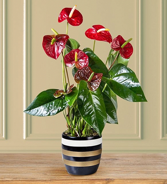 Gold Çizgili Vazoda Antoryum Bitkisi